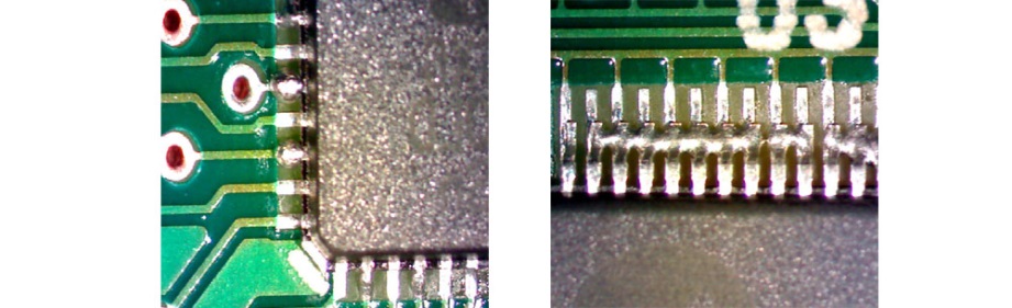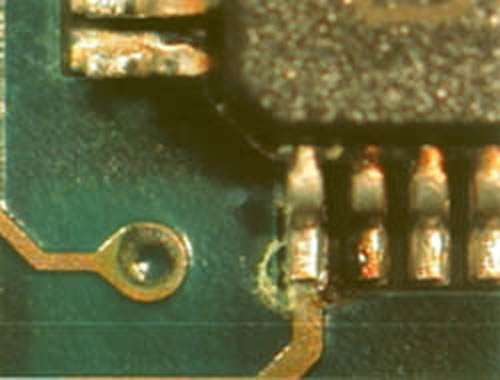 Dendritic grown between solder pads, caused by ionic contamination (photos courtesy of Foresite)