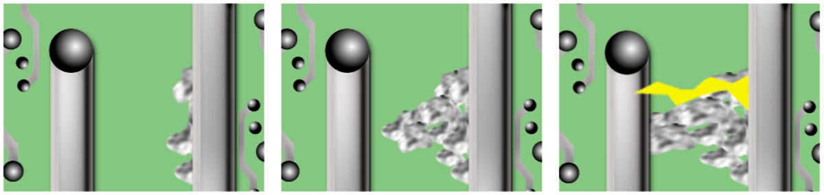 Polar or Ionic particles left from flux residue and other sources, when exposed to moisture from the ambient air and when current is applied, can connect into a chain or branch called a dendrite (Fig 1). These dendrites are conductive so form an unintended trace that cause current leakage or, over a longer period of time, even a short circuit.